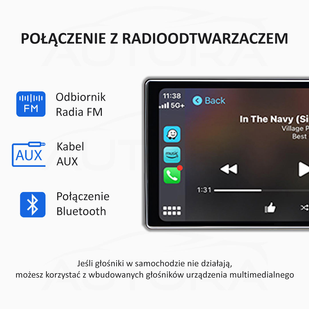Wszystkie dźwięki – muzyka, nawigacja, połączenia – będą odtwarzane przez głośniki samochodu, bez użycia kabli.